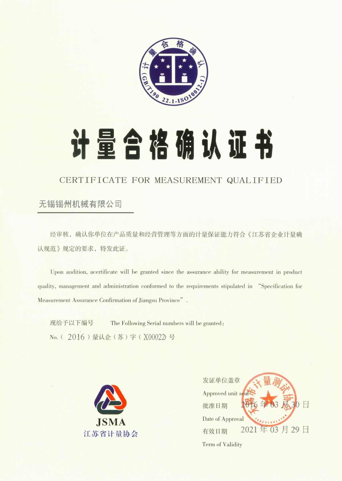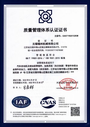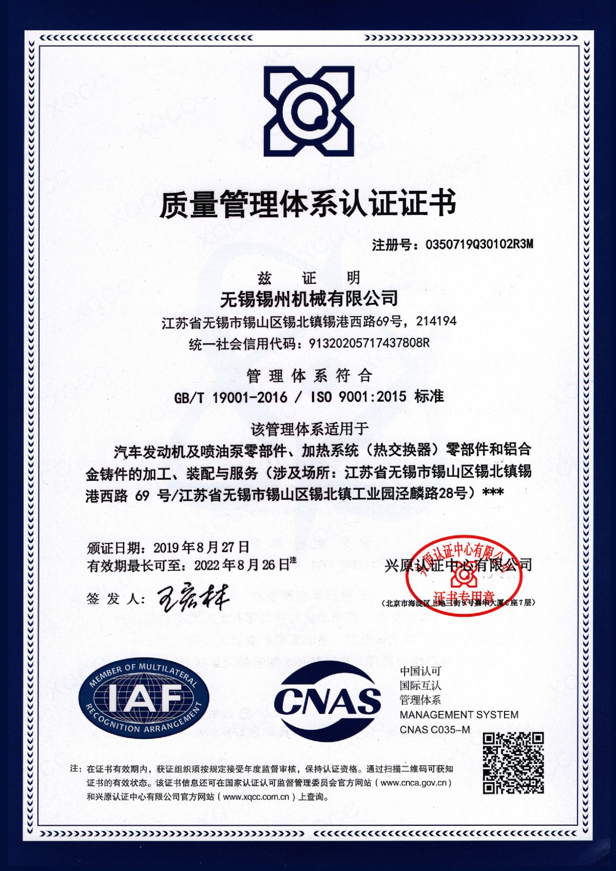 “ 以質(zhì)量求生存,以管理增效益”是錫州機械堅定不渝的經(jīng)營理念;“質(zhì)量第一、客戶至上”是錫州機械堅持不懈的追求;“ 以人為本,鑄就優(yōu)質(zhì)產(chǎn)品, 精益求精,增強顧客滿意”是錫州機械持之以恒的質(zhì)量方針。 2001年7月公司通過ISO9001:2000質(zhì)量體系認證, 2005年9月通過ISO/TS16949質(zhì)量體系認證。公司于2007年7月通過產(chǎn)品ASME認證。 通過開展以產(chǎn)品質(zhì)量為中心的企業(yè)管理,公司以先進的生產(chǎn)檢測設(shè)備、完善的質(zhì)量保證體系、嚴密的產(chǎn)品開發(fā)體系、嚴格按照標(biāo)準(zhǔn)開展產(chǎn)品生產(chǎn)管理,并開展6S現(xiàn)場管理,竭盡全力創(chuàng)造一個比較清潔、健康、安全的環(huán)境,全方位地滿足國內(nèi)外客戶的要求。